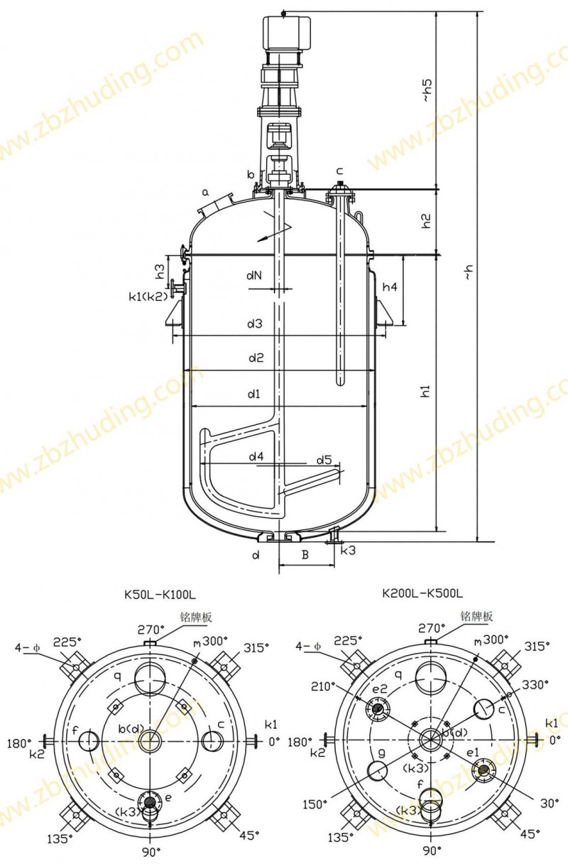 K50L-K500L開式搪玻璃反應釜(開式搪瓷反應釜)設計圖紙及參數如下所示: