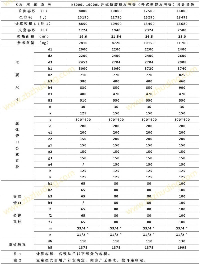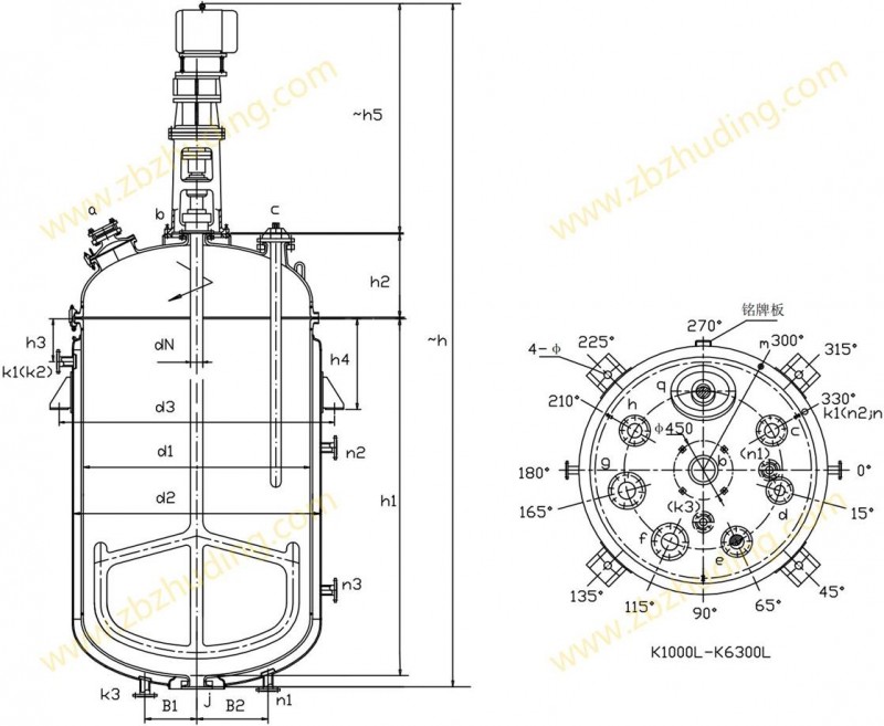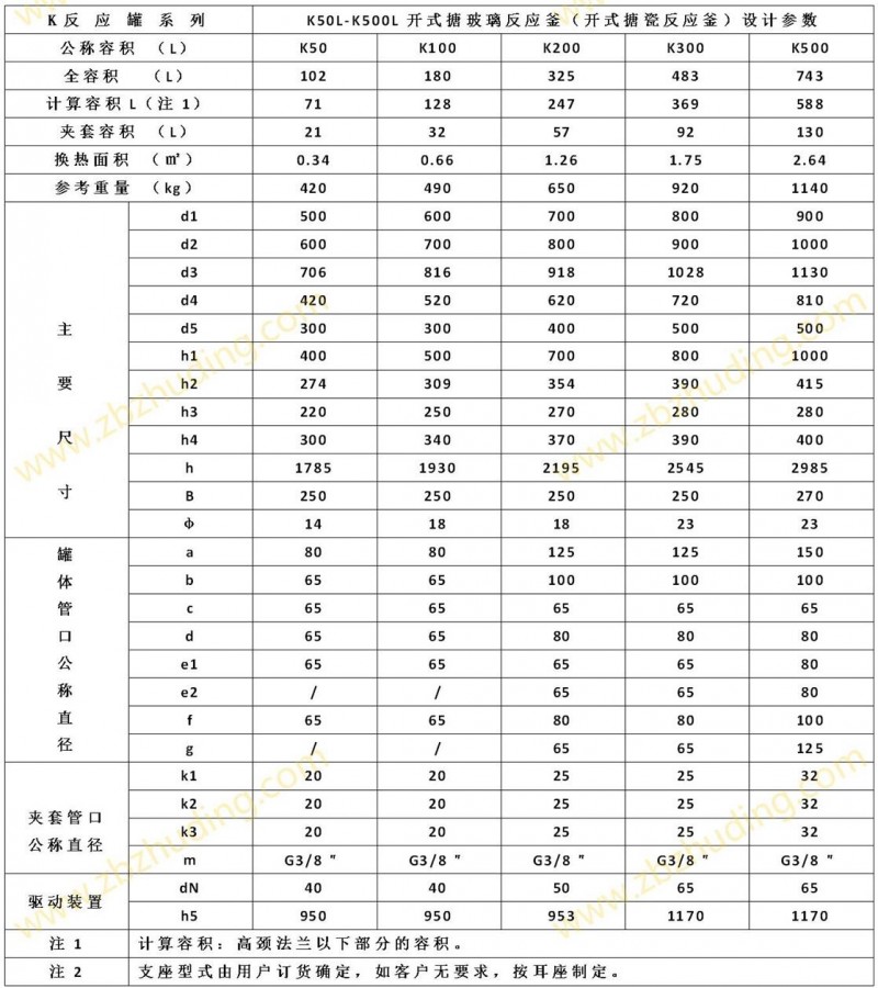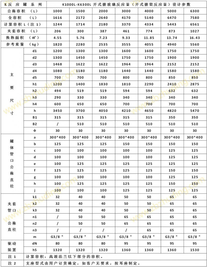 【K型搪玻璃反應器的技術參數】: K1000L-K6300L開式搪玻璃反應釜(開式搪瓷反應釜)設計圖紙及參數如下所示: